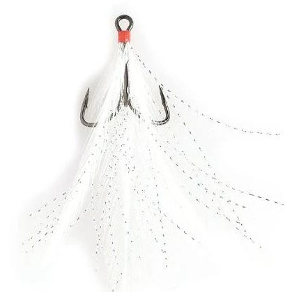 The Mustad® UltraPoint Feather Dressed Trebles are short shank treble hooks dressed with Grizzly hackle and Flashabou Mirage material. The Mustad® dressed trebles feature a total of six red Grizzly hackle feathers and additional strands of Flashabou Mirage, which adapts the surrounding colors, giving the hook a lifelike baitfish action. Excellent replacement hook for topwater hard baits and jerk baits, making the hook a great striking point.