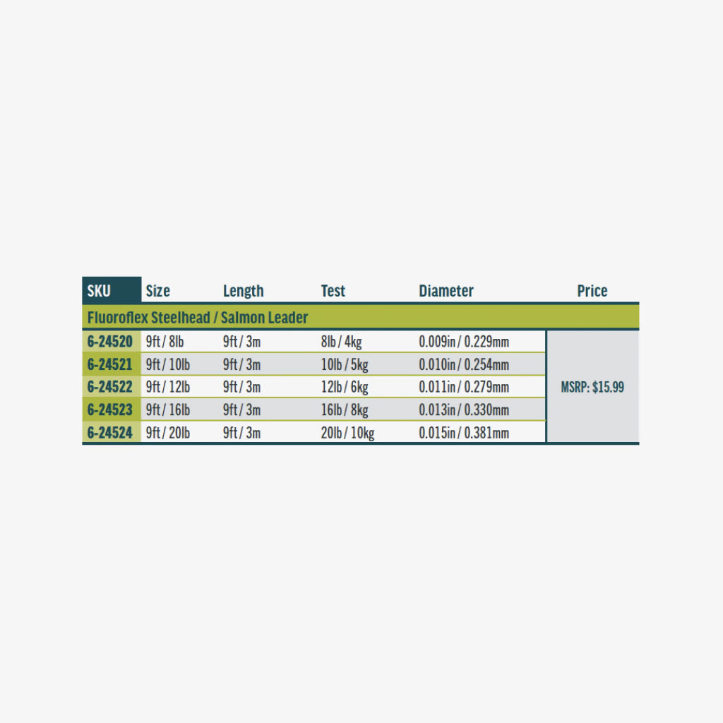 RIO's Fluoroflex steelhead/salmon leaders are made of 100% fluorocarbon, and are the perfect solution for when a nearly invisible presentation is required in low, clear rivers and for spooky summer-run fish. Each leader has high abrasion resistance, excellent tensile and knot strength and a long butt section that will turn over flies effortlessly. The leaders are 9ft in length and range from 8lb (0.009") to 20lb (0.015") in size.Medium-stiff,100% fluorocarbon tapered leader, ideal for the salmon and steelhead angler.