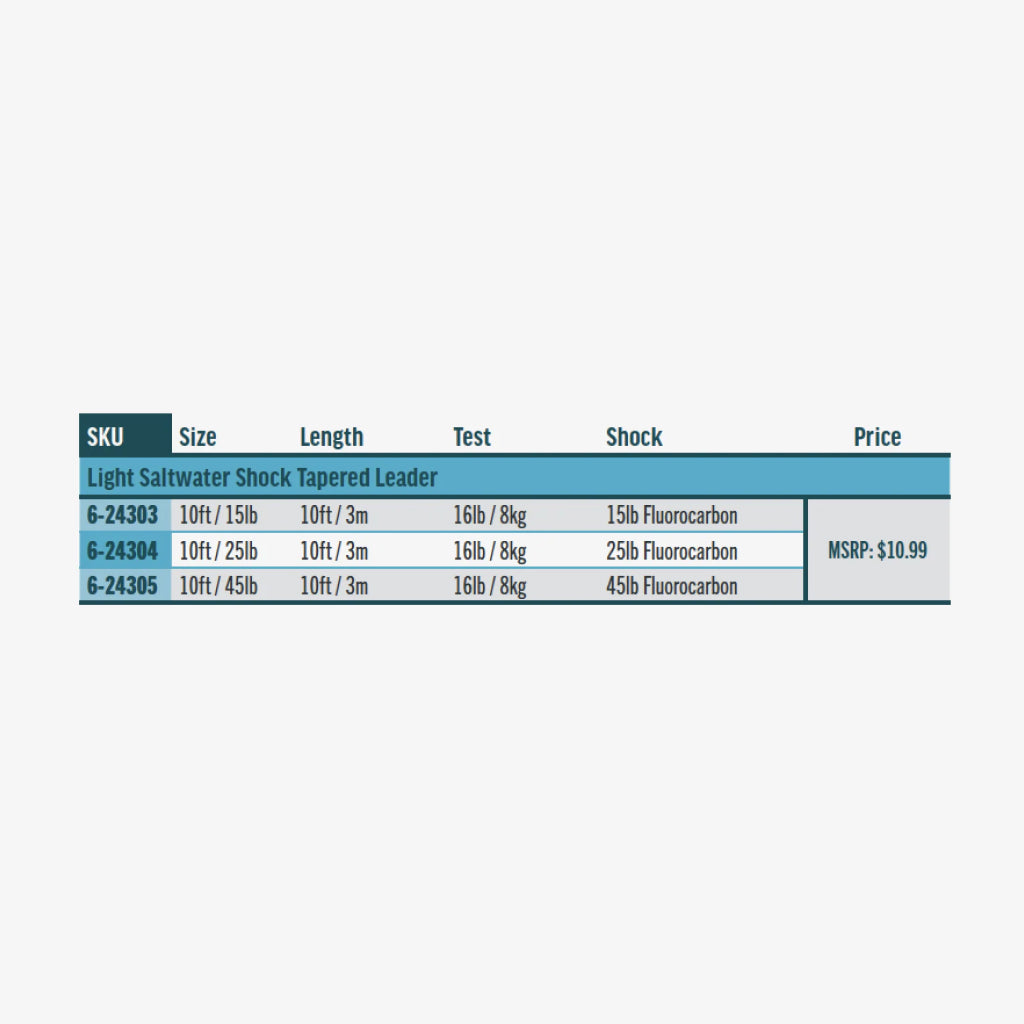RIO's light saltwater shock leaders feature a tough fluorocarbon shock tippet that protects the leader from teeth, gill plates and spines, and are ideal for snook, small tarpon and similar problem species. The main body of the leader is made with a stiff nylon that tapers down to 16lb before being tied to the shock tippet. Each leader is 10ft long and available with either 15lb, 25lb or 40lb fluorocarbon shock tippet. Medium-stiff tapered leaders with a tough fluorocarbon shock tippet.
