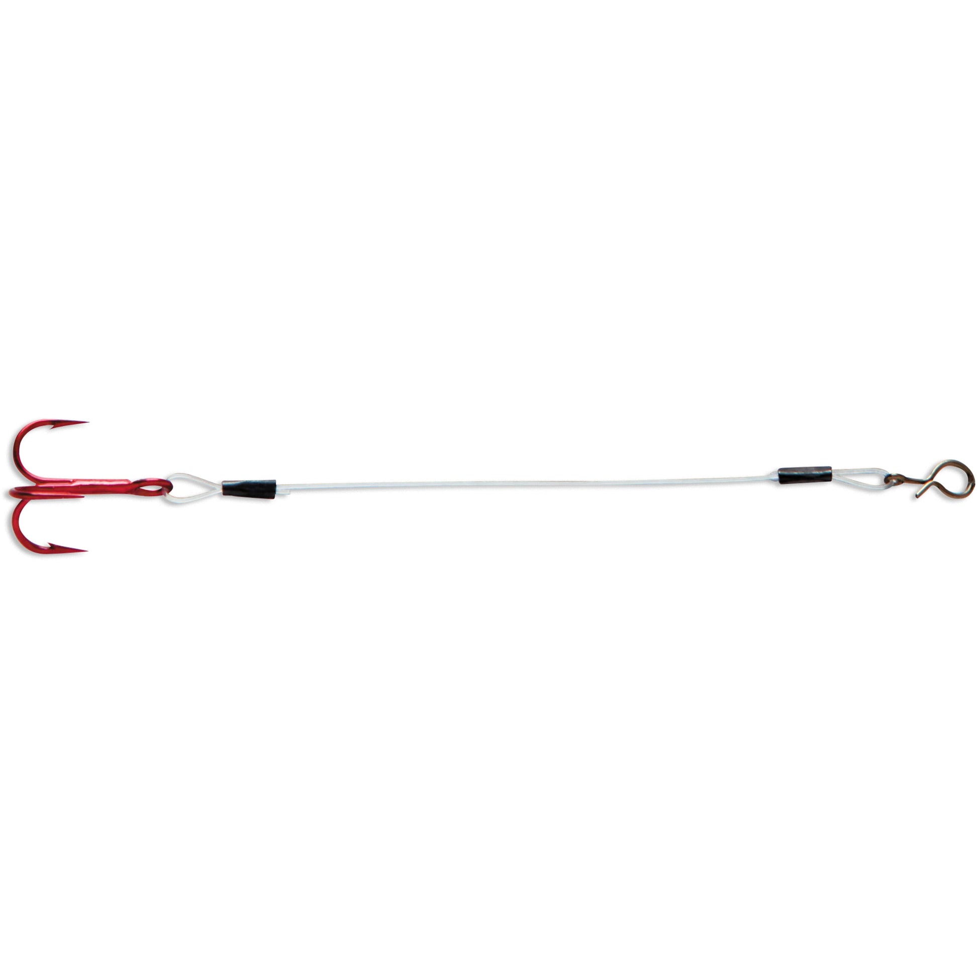 The VMC Quik Strike Treble Trailer Hook is a premium treble trailer hook rig assembled with Sufix 12 pound fluorocarbon leader, a "Fast Snap" connector, and a size 10 high-carbon steel hook. It's designed to help with hook-up ratios when fish are short striking your lure. It can also be used for rigging larger live baitfish for muskie and pike. Available in Red and Black Nickel finishes with 2 or 3 inch leader.